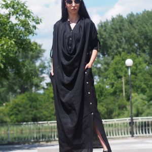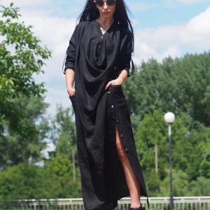 Make a bold fashion statement with this black asymmetric sleeveless dress crafted from natural linen. Its sculptural silhouette, clean lines, and side-button detailing offer an edgy and sophisticated look that s perfect for fashion-forward wardrobes.