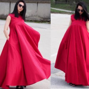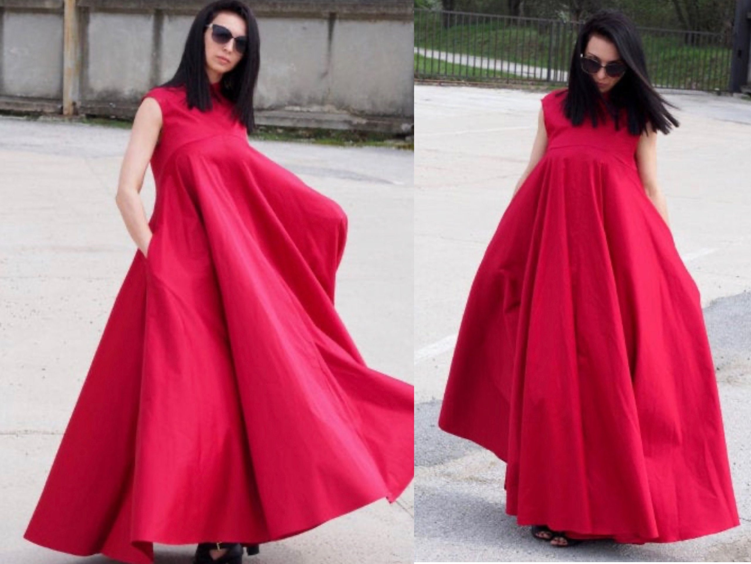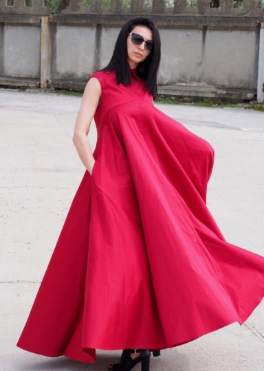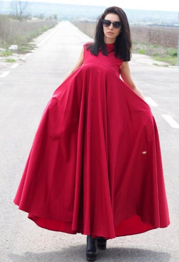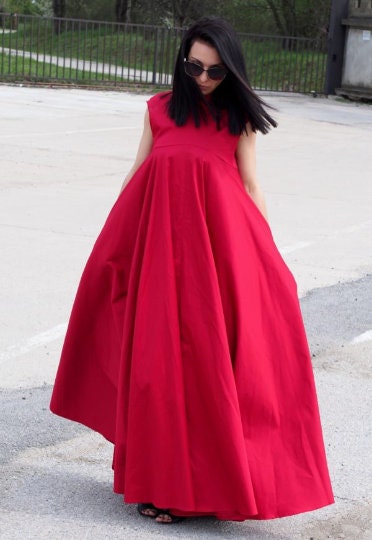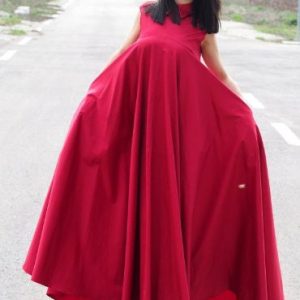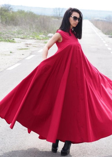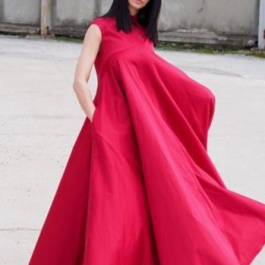 Make a bold and sophisticated statement with this sleeveless red cotton maxi dress. Designed with a voluminous A-line silhouette, this swing dress offers both drama and comfort. The structured collar adds a sharp detail to the otherwise soft and flowing shape, creating a modern and artistic profile.
